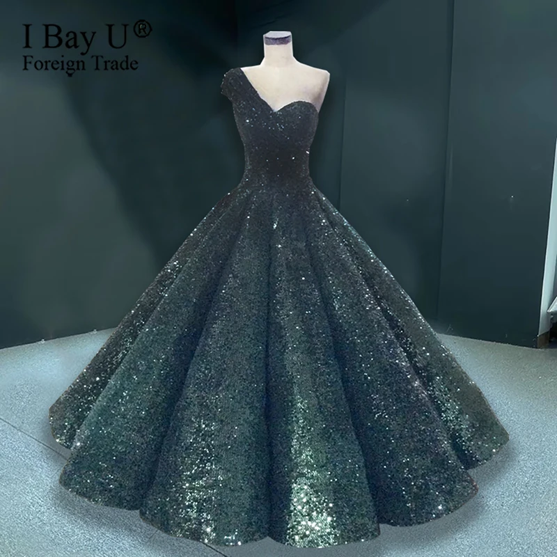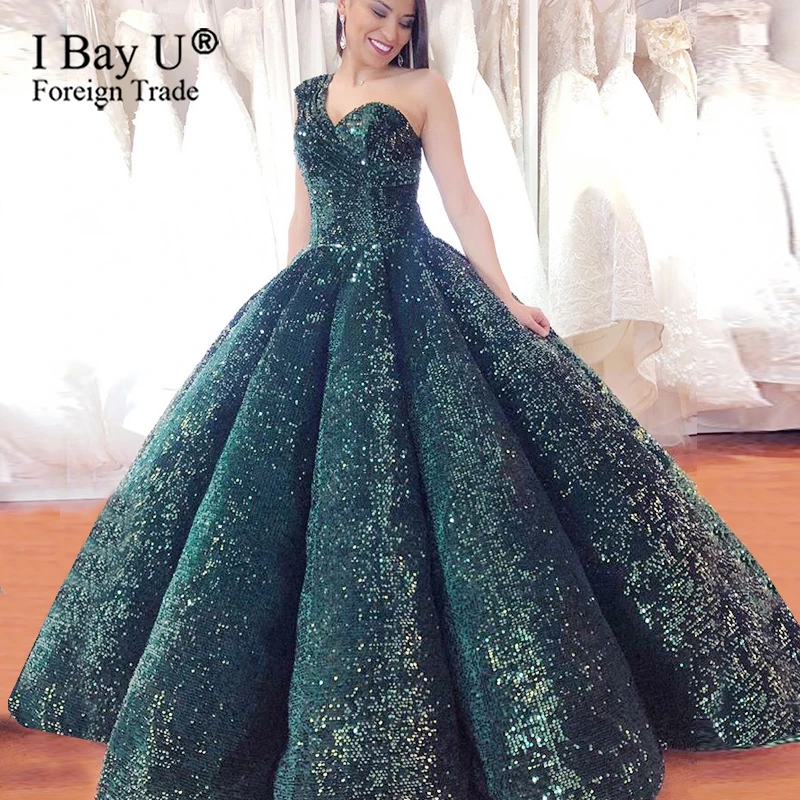 HIGH QUALITY Sparkly Dark Green Sequin Formal Evening Dresses Masquerade Sweetheart Ball Gowns One Shoulder Part